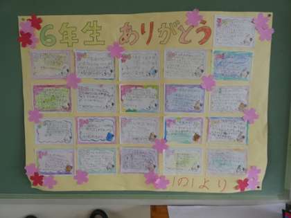 卒業に向けての校内の掲示物 公開日 2025/03/11 更新日 2025/03/11 お知らせ 校内の掲示物も卒業を意識したものが、たくさんあります。写真は、6年生への感謝のメッセージが貼られたものです。