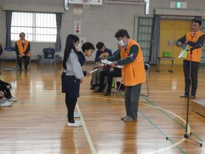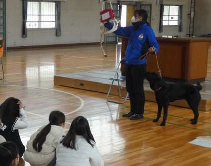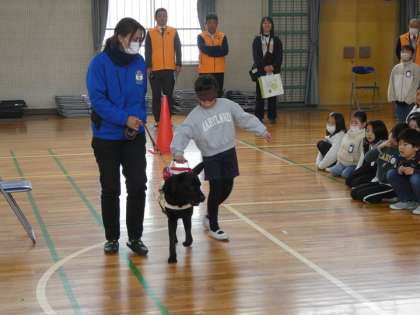 3年生は、盲導犬のパピウォーカーの家族に引き渡す仔犬委託式に参加しました。そして、中部盲導犬協会の方のお話を聞きました。その後で、代表の児童が、アイマスクをつけて、歩行体験をしました。今年度、3年生は、「みんなにやさしい町」の学習で福祉について興味をもつようになり、先日の授業参観では、手話付きの合唱を披露しています。そんな3年生だから、今日の学習にたいへん興味をもって臨むことができました。