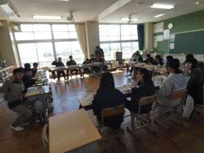 畝部小学校での給食もあと2回、机を輪にして給食を食べていました。