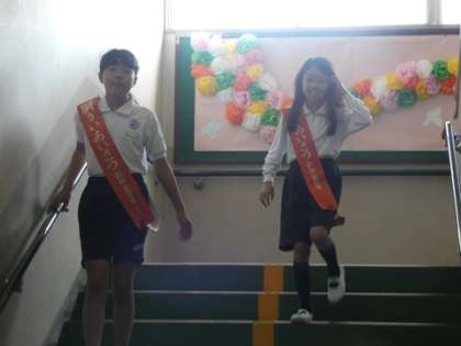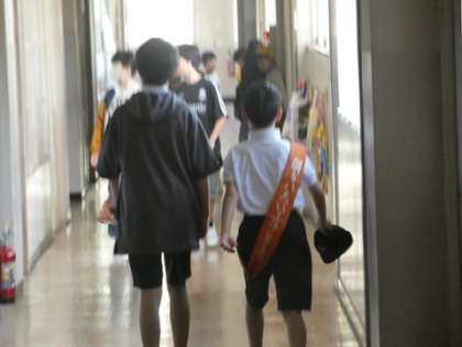 すがすがしい朝の廊下に「おはようございます。」のさわやかなあいさつの声が響いています。運営委員が、あいさつ運動のタスキをつけて、すれちがう人にあいさつをしながら廊下を歩いています。あいさついっぱいの畝部小学校にしていきましょう。