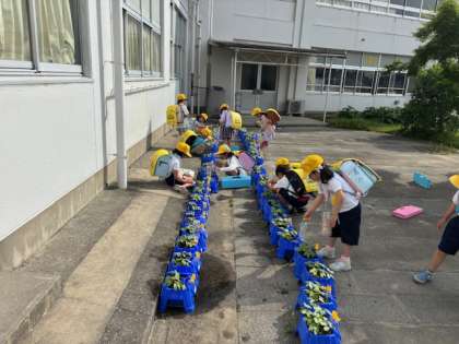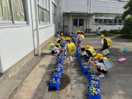 朝、登校するとペットボトルで朝顔の水やりをするのが日課です。暑さに負けず、元気に育っています。
