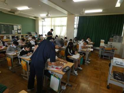 6年生の算数の授業は、二人の先生(TT)で教えています。机間を巡視して、丁寧にアドバイスをしています。