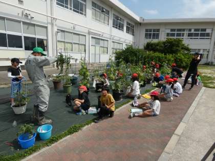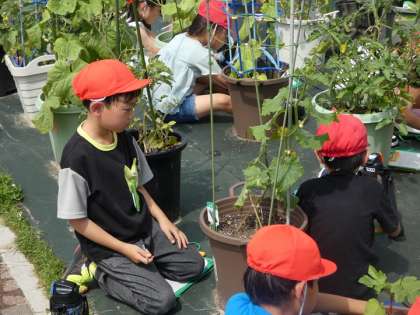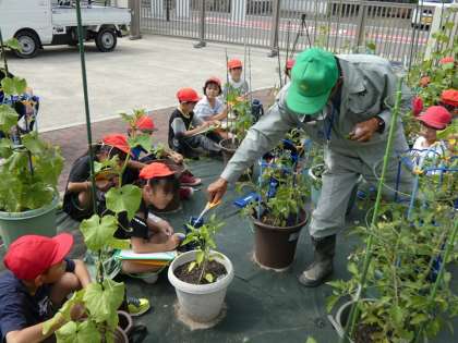 夏野菜が大きくなってきたので、育て方や収穫について講師の方に教えていただきました。