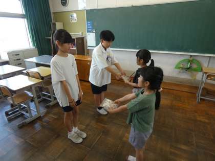 1年生の子たちも青少年赤十字に入会して、ピンバッチをもらいました。