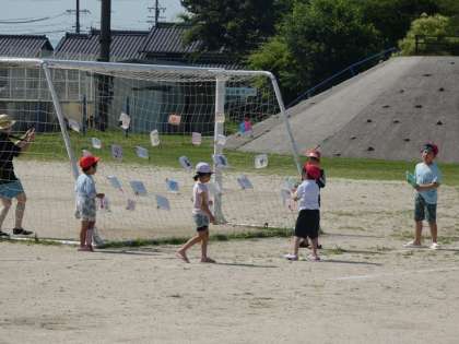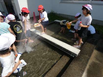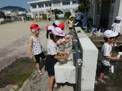 今年から水泳の授業はスイミングスクールで行うことになりました。バスでの移動の時間もかかるので、1年生は、水着にスムーズに着替えられるように練習しました。水着に着替えたので、その後に水遊びをしました。暑い日の水遊びは、とても気持ちよさそうでした。