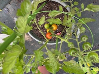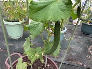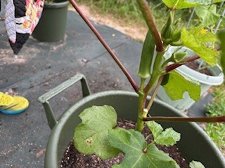 2年生の育てている夏野菜が実をつけています。オクラにミニトマト、キュウーリがなっています。