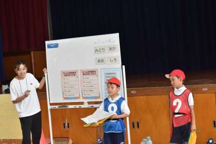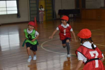 体育の授業で研究授業を行いました。班で作戦を工夫して、宝運び鬼をしました。作戦が成功してポイントがアップしたのでみんな満足していました。