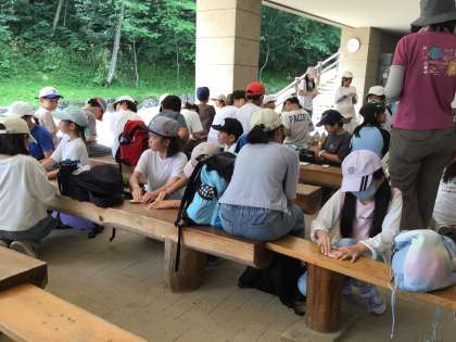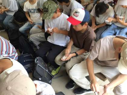 活動開始です。木端を紙やすりでひたすら磨いて、ウッドバッチ作りでポスカの色がのりやすいように頑張っています。