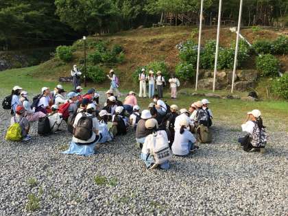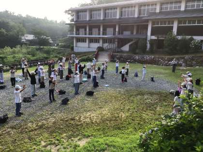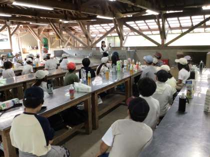健康観察をして、朝の集いをしました。山の学習参加者はみんな元気です。今から朝食のカートインピザ作りです。