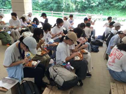 さえずりホールでお弁当を食べました。この後、クラフト「写真立て」作りの活動に入ります。