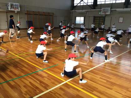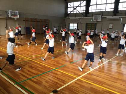 中学年(3年生、4年生〕は、みんなで体育館で運動会で披露するソーラン踊りの練習をしました。