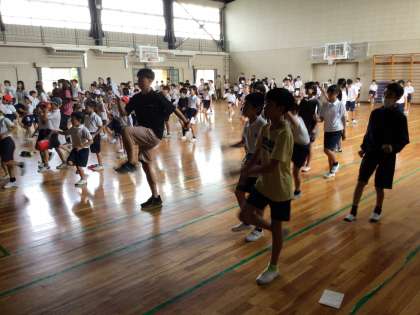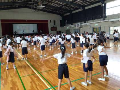腸活ダンス 公開日 2025/09/29 更新日 2025/09/29 お知らせ 2時間目の後の放課に保健委員会からの呼び掛けで、有志が体育館に集まって腸活ダンスを踊りました。腸活ダンス初日でしたが、体育館にはびっくりする程たくさんの畝部っ子が、腸活カード片手に集まり、元気に腸活ダンスを踊りました。保健委員さんたちも手応えをつかんだようの笑顔がすてきでした。