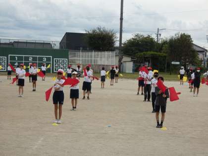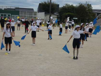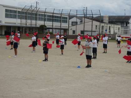 運動場で高学年の旗の練習がはじまりました。畝部小学校の校舎に旗が空気を切る音が響きます。見ている人に表現したいことを伝えることは、簡単なことではありません。高学年みんなで一つのものを作り上げることは、さらにたいへんなことです。しかし、こういった仲間との取り組みが個人や集団の成長につながると考えています。10月18日の運動会を楽しみにしていてください。