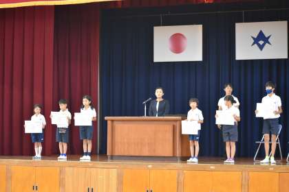 また、その後、作文・詩、読書感想文、校内交通安全標語コンテストで優秀な成績をとった子の表彰がありました。