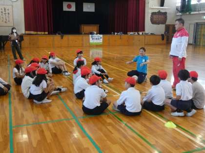 様々な競技の現役選手やOB、OGなどを「夢先生」として学校へ派遣し、「夢を持つことや、その夢に向かって努力することの大切さ」「仲間と協力することの大切さ」などをJFAこころのプロジェクト「夢の教室」。畝部小学校では、ここ数年毎年、夢先生に来ていただいています。今年度は、中京大学水泳部コーチで何人ものオリンピック選手を育てている佐々木祐一郎氏を夢先生に迎えて楽しい雰囲気の中で行われました。
