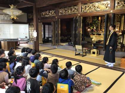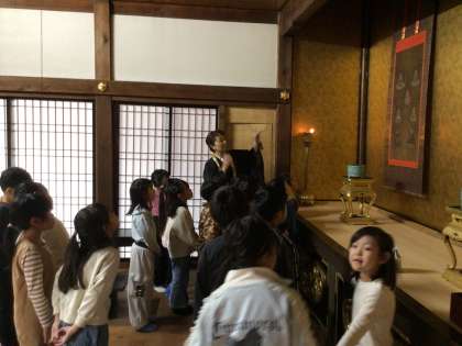 2年生は、まちたんけんで町のすてきなところを探して校外に出かけました。願成寺を訪問し、願成寺を守っている方のお話を聞きました。