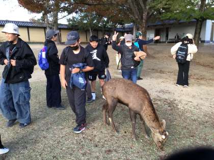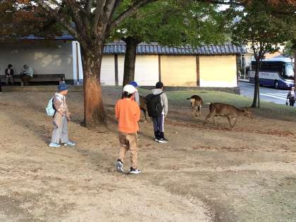 修学旅行13 奈良 三条通り 公開日 2025/11/06 更新日 2025/11/06 学校行事 奈良公園に到着しました。今から三条通りでお土産を買います。集合場所にも鹿がいてこどもたちは大喜びしています。