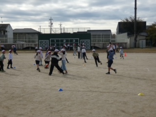 縦割り班で6年生が準備した鬼ごっこやタグ取りなどの遊びで楽しく過ごしました。