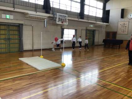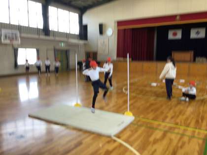 4年生の体育では、走り高跳びを練習しています。何度も何度もはさみとびに挑戦していました。