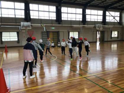 ボールを使って、ゴール型ゲームの楽しさを少しずつ味わっているようです。