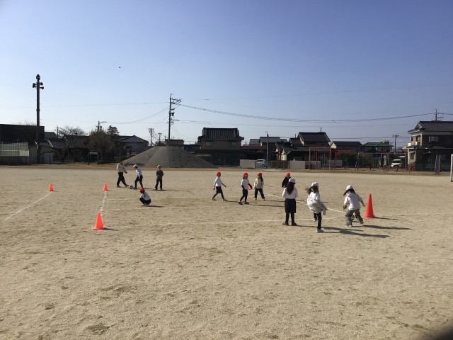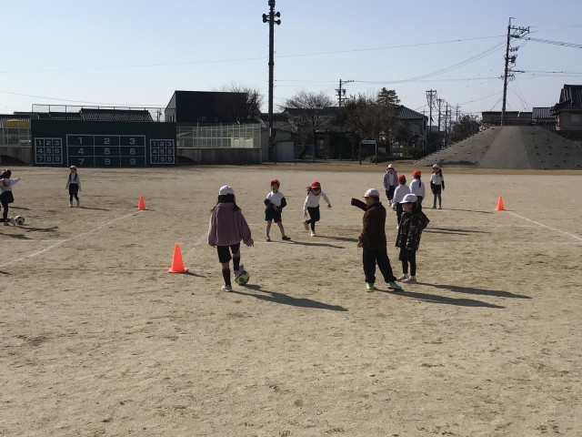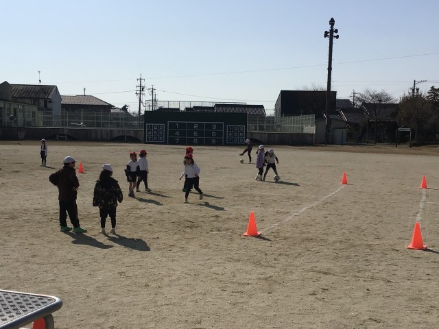 ボールを蹴る練習をしています。最後にゲーム形式の練習で楽しみました。