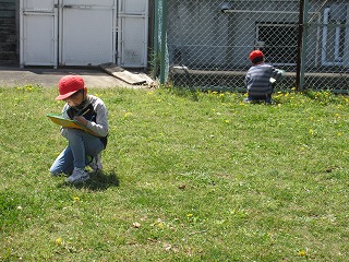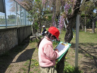 生活科で春見つけをしました。サクラ、フジ、タンポポ等を見つけて絵に描きました。