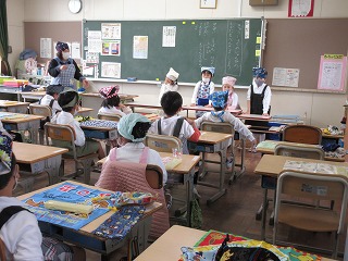 初めての給食です。エプロンとバンダナを着けて準備をし、配膳の仕方を学びました。