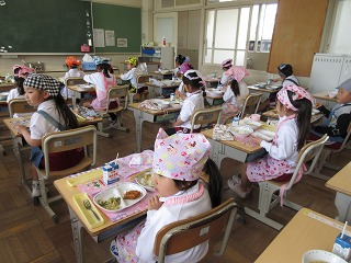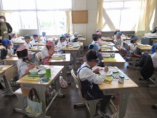小学校生活、初めての給食でした。メニューは、サクラエビのかき揚げ、青梗菜とツナの和え物、かきたま汁でした。