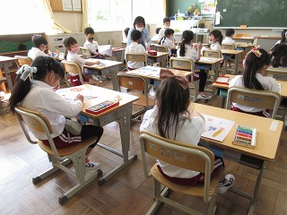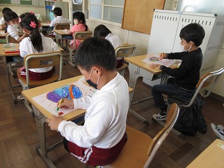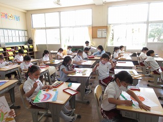 図画工作科で自分だけの太陽を描きました。いろいろな色を使ったり、顔を書いたりして楽しく描きました。