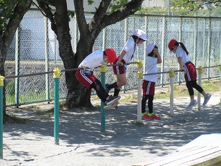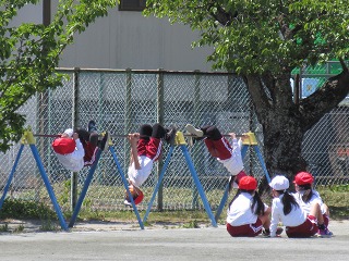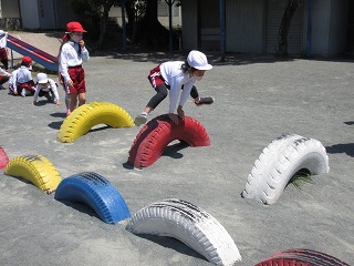 体育科でタイヤ跳びや鉄棒遊びをしました。