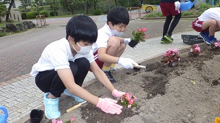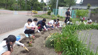 緑化委員の子どもたちが、花壇に夏の花の苗を植えました。
