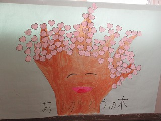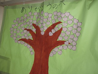 「ありがとう」の木をつくりました。友だちのよいところを見つけていきます。