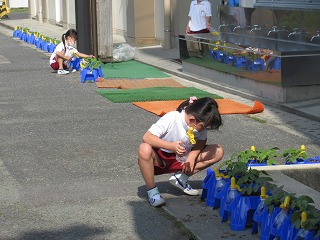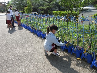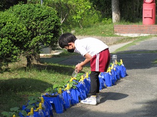 生活科で栽培活動をしています。登校後、自分の植物の水やりに行きます。