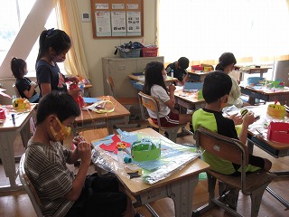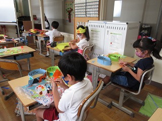 図画工作科で「わっかでへんしん」の学習をしています。頭飾りやベルトを作って自分がなりたいものに変身します。