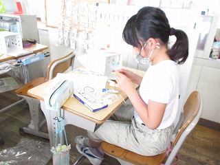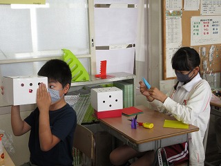 図画工作科で「箱の中をのぞいて」の制作活動をしています。箱の中の世界を紙粘土や身の回りにあるものを使って作っています。