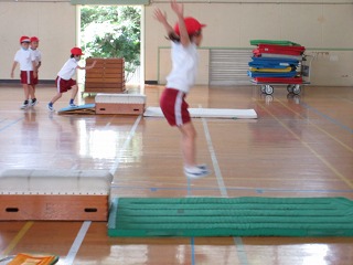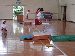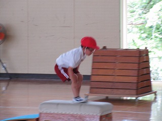 体育科でとび箱運動をしました。とび箱を跳んだり、跨いだりしました。