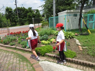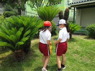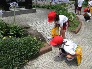 生活科で学校内にいる生き物を探しに行きました。ダンゴムシ、ミミズ、チョウなどを見つけました。