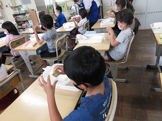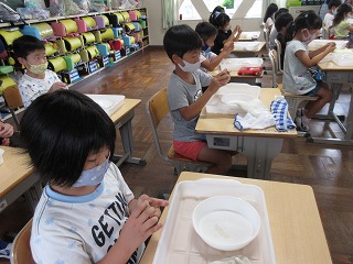 ものづくり講師の方に土だんごの作り方を学びました。1年1組が光る土だんごを作りました。
