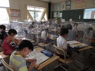 9月スタート 公開日 2021/09/01 更新日 2021/09/01 お知らせ 新型コロナウイルス感染症から子どもたちを守るため、席は間隔をあけて、一人一人が机にガードを付けて学習に取り組んでいます。音楽では、吹かずに指を動かして練習をしています。