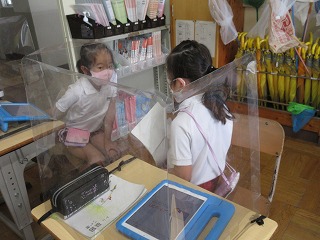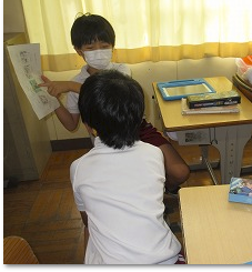 国語科で絵を見てお話を作っています。作った作品をペアで読み合い、アドバイスしました。