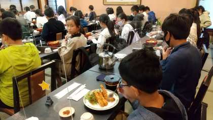 昼食です。エビフライカレーを食べています。