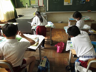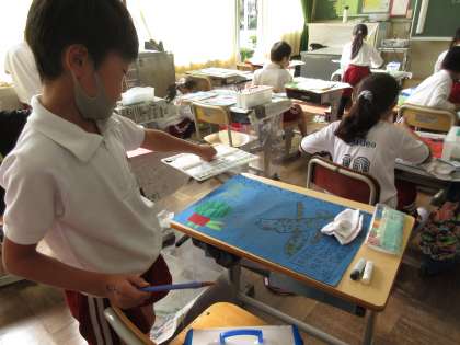 図画工作科で、「すいかぼうず」のお話の絵を描いています。