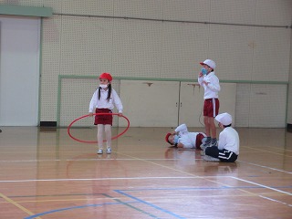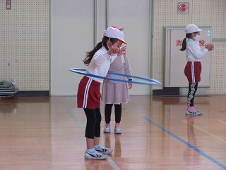 体育科と音楽科を組み合わせて曲に合わせてフラフープを跳んだり、回したりしました。
