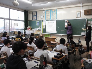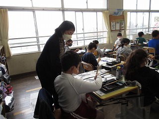書き初めの練習をしました。書道家の先生からポイントを習いました。