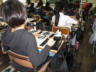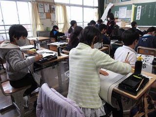書写の時間に書き初め大会で書く「春の足音」の練習をしました。