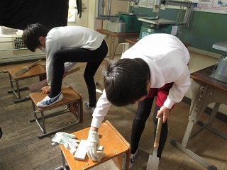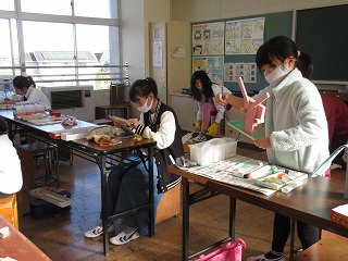 図画工作科でのこぎりで切った木を組み合わせて作品を作っています。