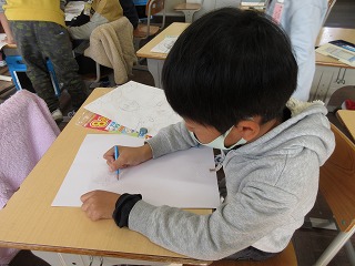 図画工作科で紙版画をします。楽しいできごとを描きました。