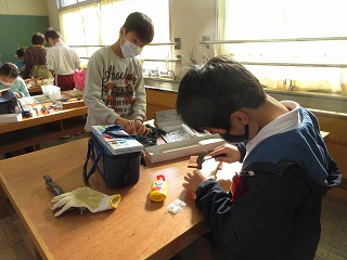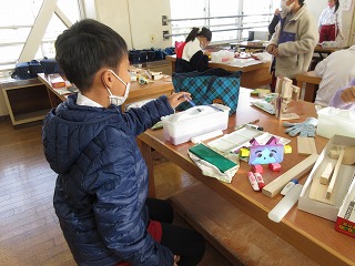 図画工作科でのこぎりや金づちを使って作品を作っています。