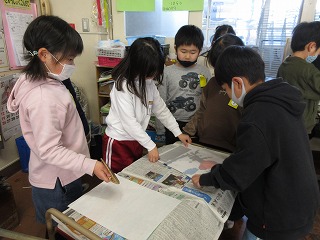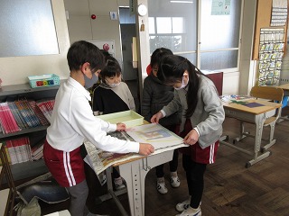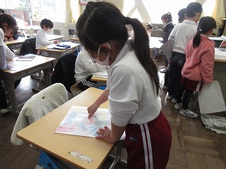 図画工作科で紙版画をしました。水に付けて写し出しました。