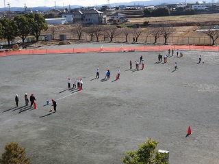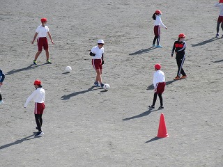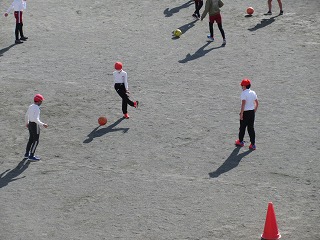 体育科でサッカー型のゲームをしています。蹴る練習をしました。
